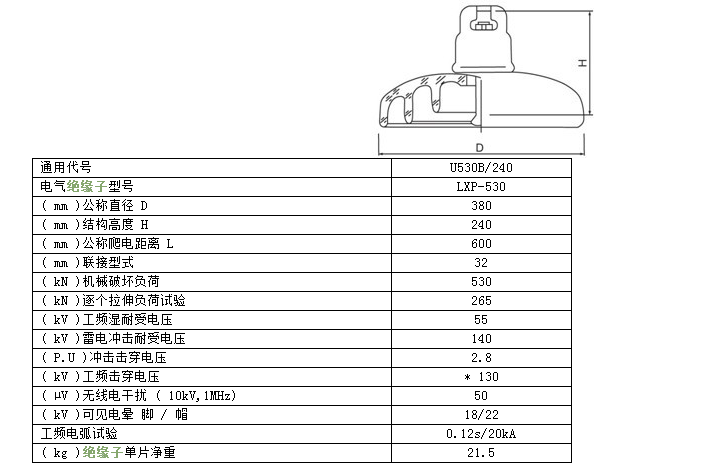 二、LXP-530标准型盘形悬式玻璃绝缘子--外观及参数